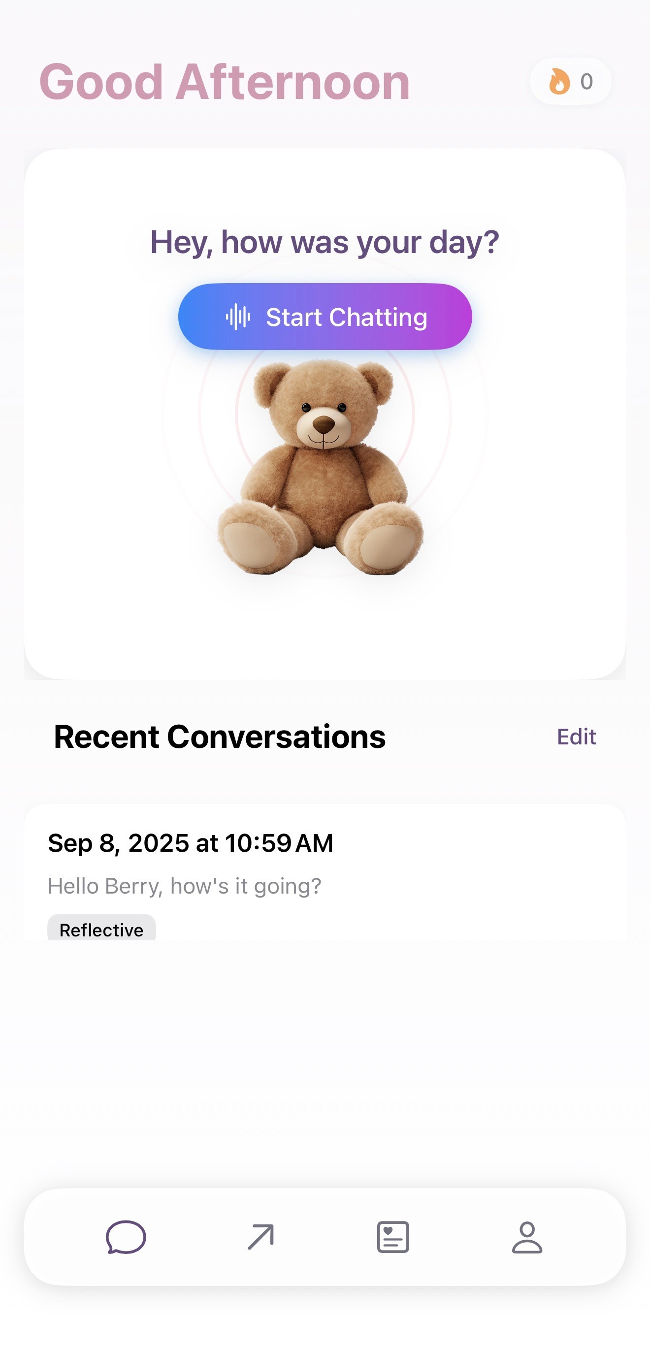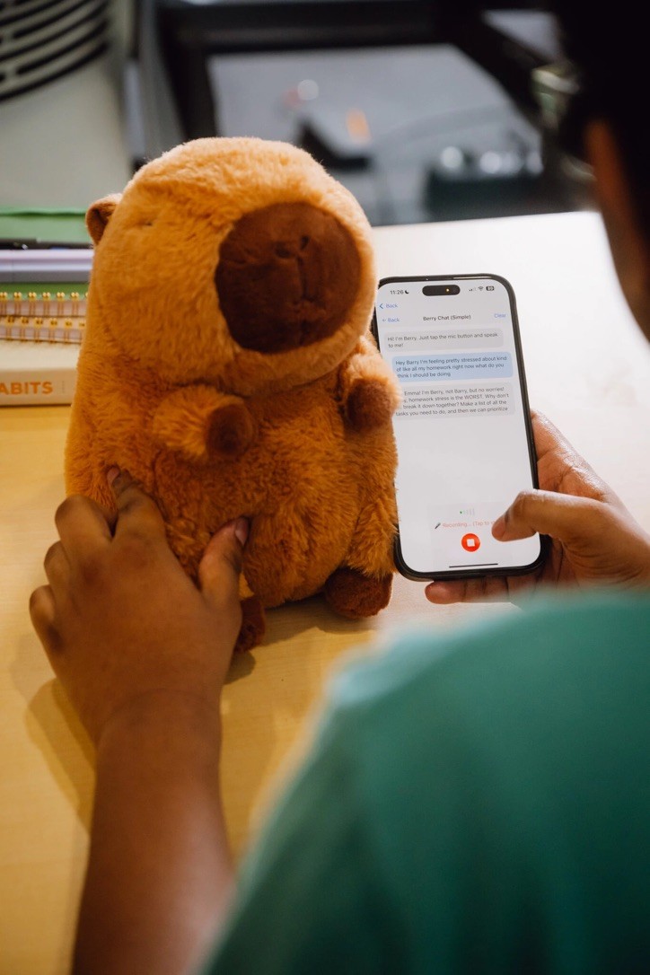 push a button on Berry's chest to speak. It's available 24/7 so you can chat in the morning, after a long day, or even super late at night if you need to chat.